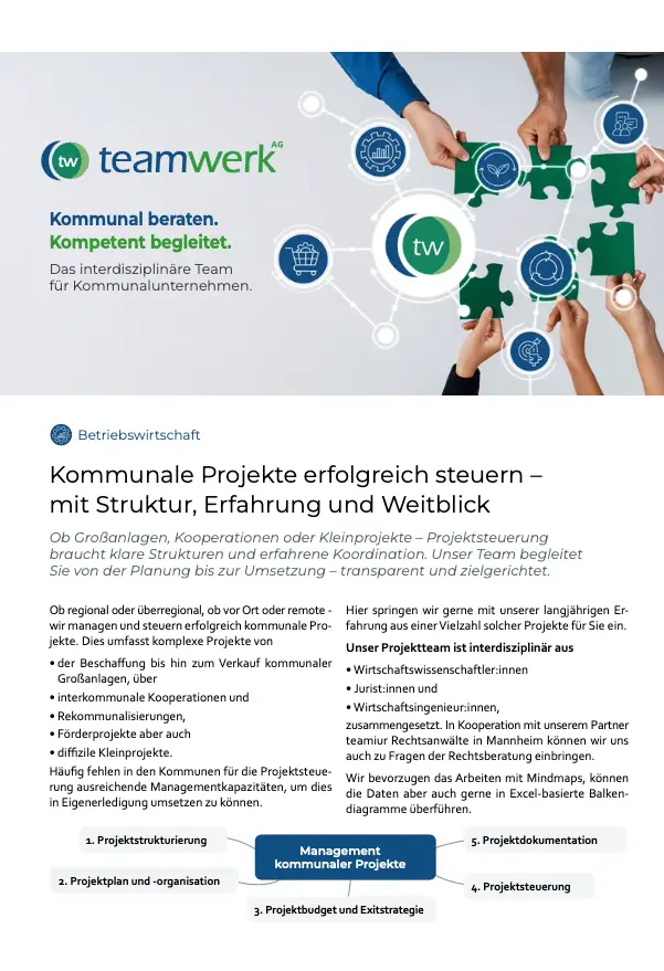 Wenn komplexe Projekte in Kommunen anstehen, fehlt es oft an Managementkapazitäten und Erfahrung für eine zielgerichtete Steuerung. Dieses Produktblatt zeigt, wie die teamwerk AG kommunale Projekte strukturiert, Budgets und Fristen im Blick behält und für Transparenz sorgt – vom Großprojekt bis zur diffizilen Einzelfrage.