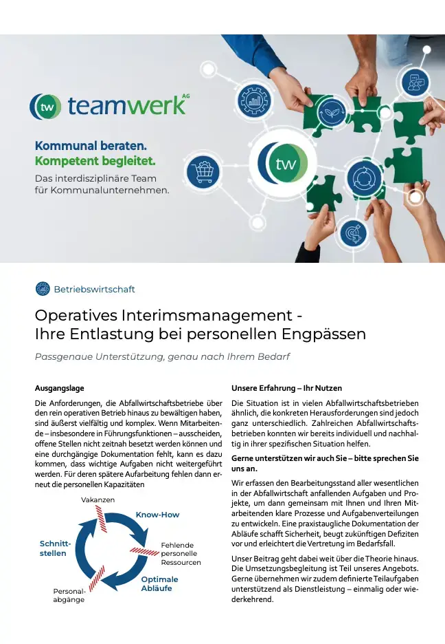 Wenn Schlüsselpersonen fehlen oder Prozesse ins Stocken geraten, hilft gezielte externe Unterstützung. Dieses Produktblatt zeigt, wie Sie mit Interimsmanagement von teamwerk Ausfälle kompensieren, Struktur schaffen und Ihre Abläufe nachhaltig absichern – flexibel, praxistauglich und auf Ihre Situation abgestimmt.