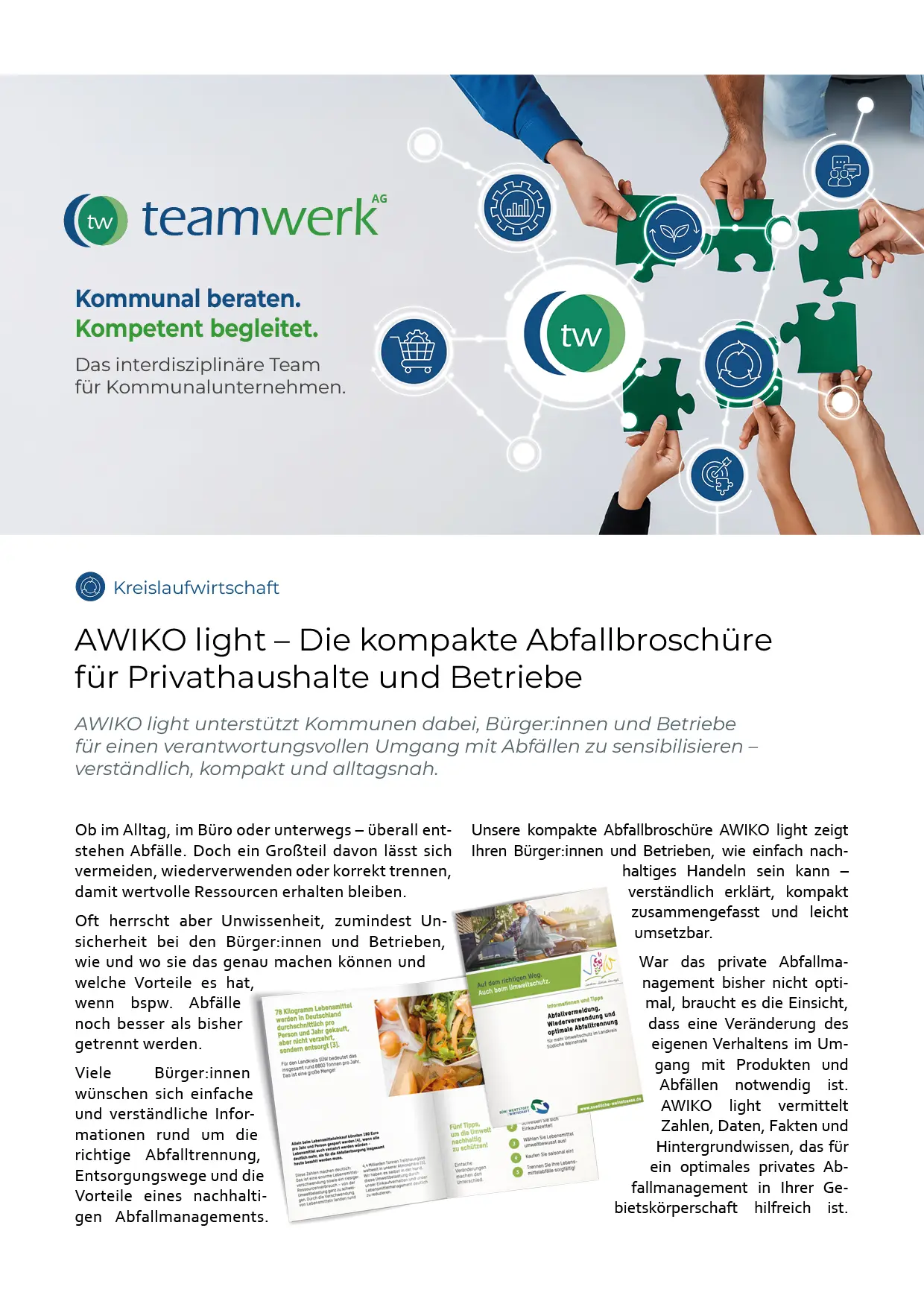 Viele Bürger:innen und Betriebe wünschen sich verständliche Infos zur richtigen Abfalltrennung. AWIKO light macht nachhaltiges Handeln greifbar – kompakt, alltagsnah und individuell auf Ihre Region zugeschnitten. Die Broschüre motiviert, informiert und entlastet Ihre kommunale Öffentlichkeitsarbeit.