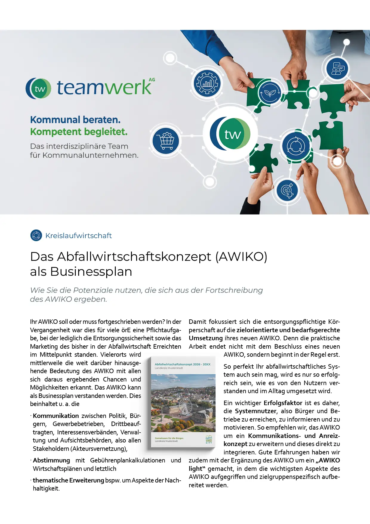 Ein AWIKO ist weit mehr als eine abfallrechtliche Pflicht – es kann zur strategischen Grundlage einer nachhaltigen, wirtschaftlich abgestimmten Kreislaufwirtschaft werden. Dieses Produktblatt zeigt, wie Sie Ihr AWIKO zielgerichtet weiterentwickeln und alle relevanten Akteure sinnvoll einbinden.
