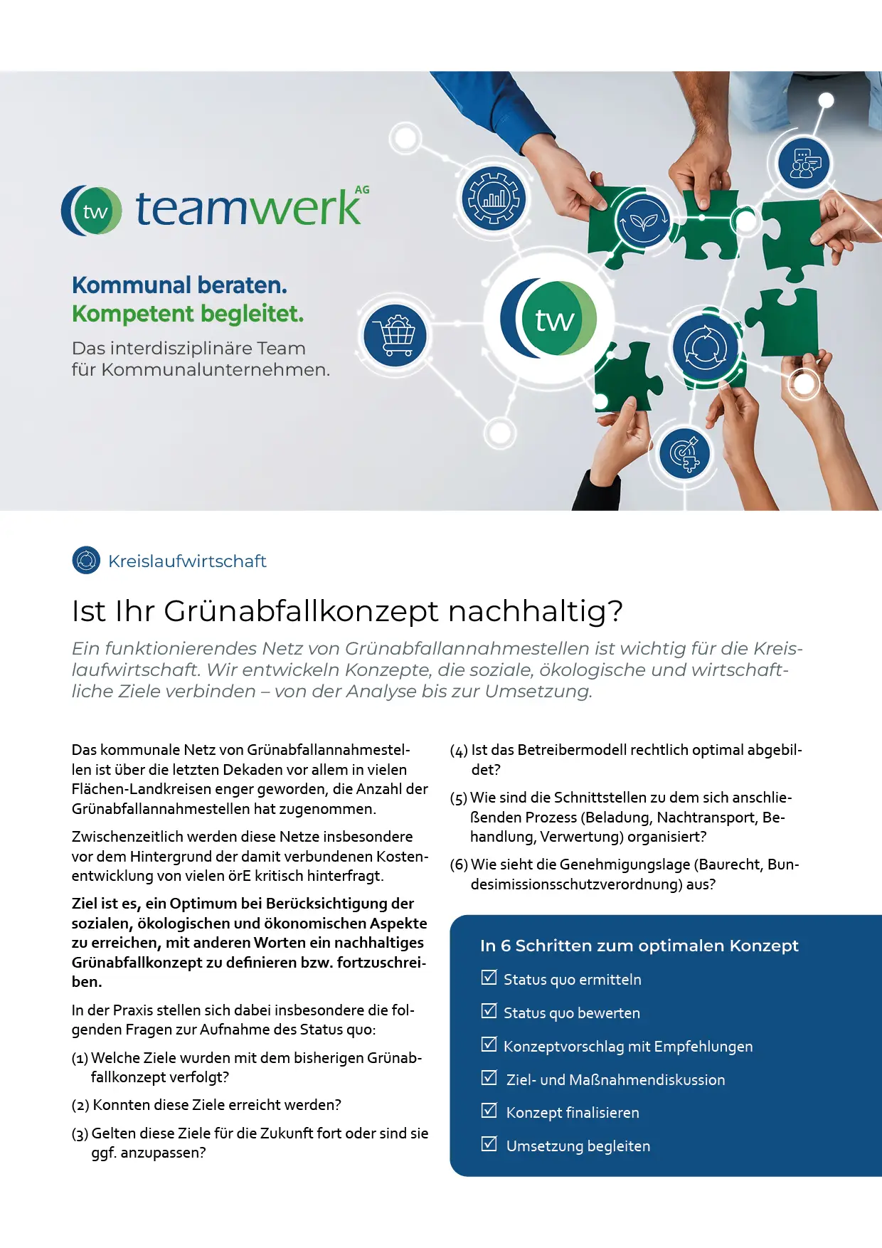 Ein funktionierendes Netz von Grünabfallannahmestellen ist ein wichtiger Bestandteil der Kreislaufwirtschaft. Dieses Produktblatt zeigt, wie Kommunen soziale, ökologische und wirtschaftliche Aspekte in Einklang bringen und so ein nachhaltiges Grünabfallkonzept entwickeln – von der Analyse des Status quo bis zur erfolgreichen Umsetzung.