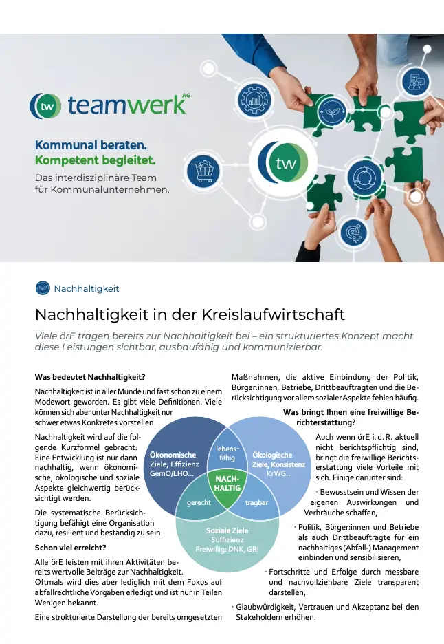 Viele Kommunen leisten bereits heute einen wichtigen Beitrag zur Nachhaltigkeit – doch selten wird das strukturiert sichtbar gemacht. Dieses Produktblatt zeigt, wie Sie Ihre Leistungen analysieren, strategisch weiterentwickeln und mit freiwilliger Berichterstattung Vertrauen und Wirkung schaffen.